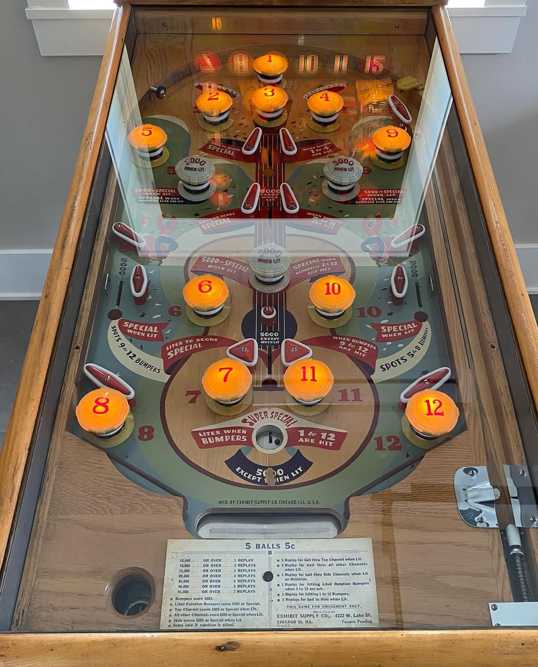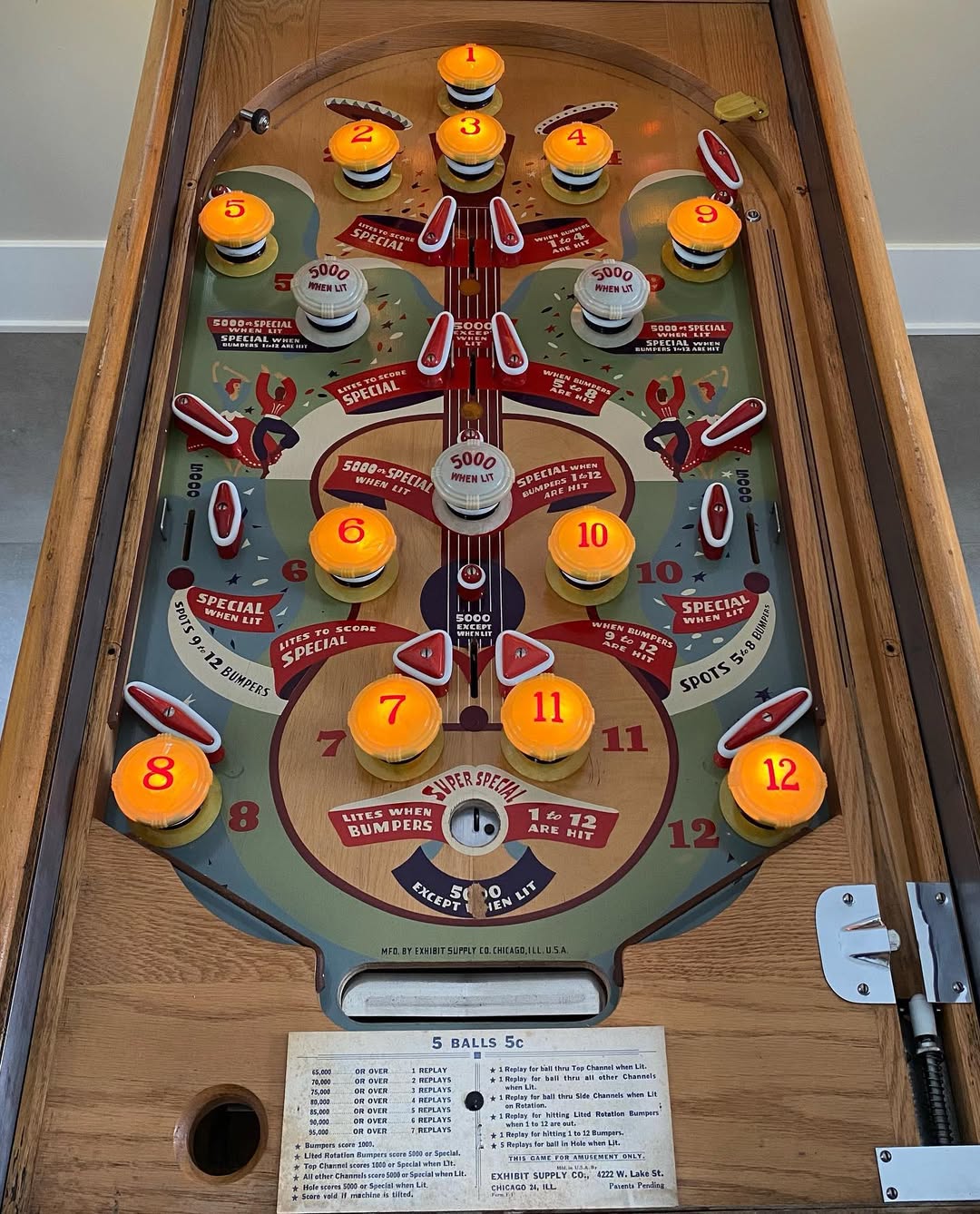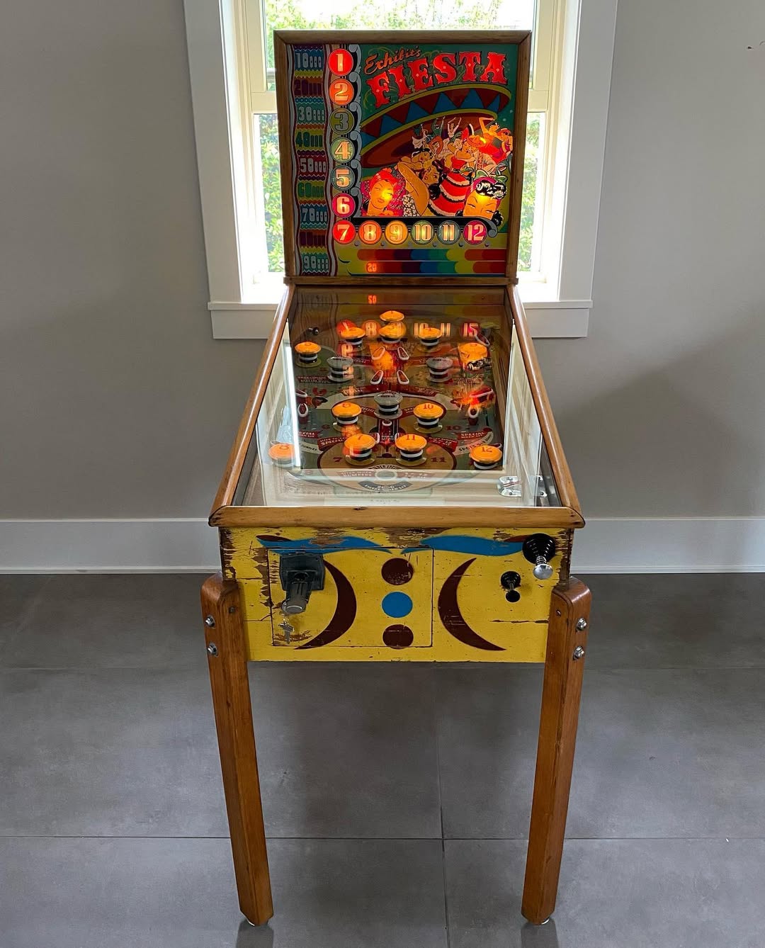 1946 Exhibit Fiesta pinball machine, vintage pinball machine for sale, restored mechanical pinball, Exhibit Supply Company pinball, antique pinball restoration, classic pinball machine, collector pinball, vintage arcade game, home game room pinball, refurbishedpinballshop.com