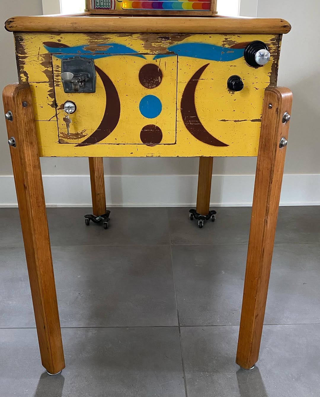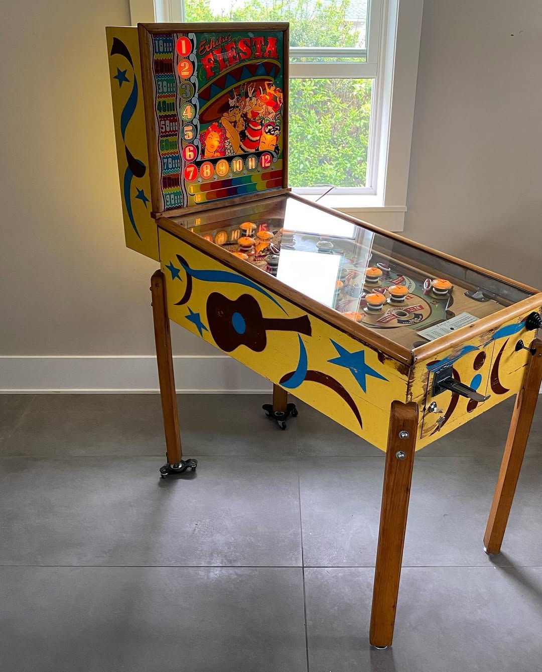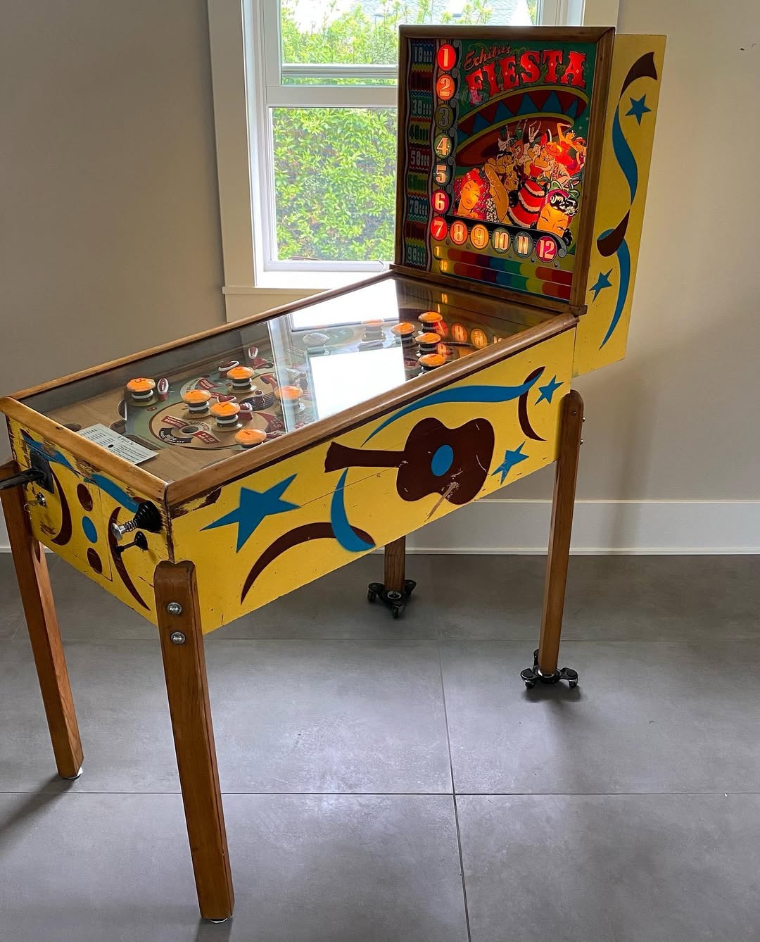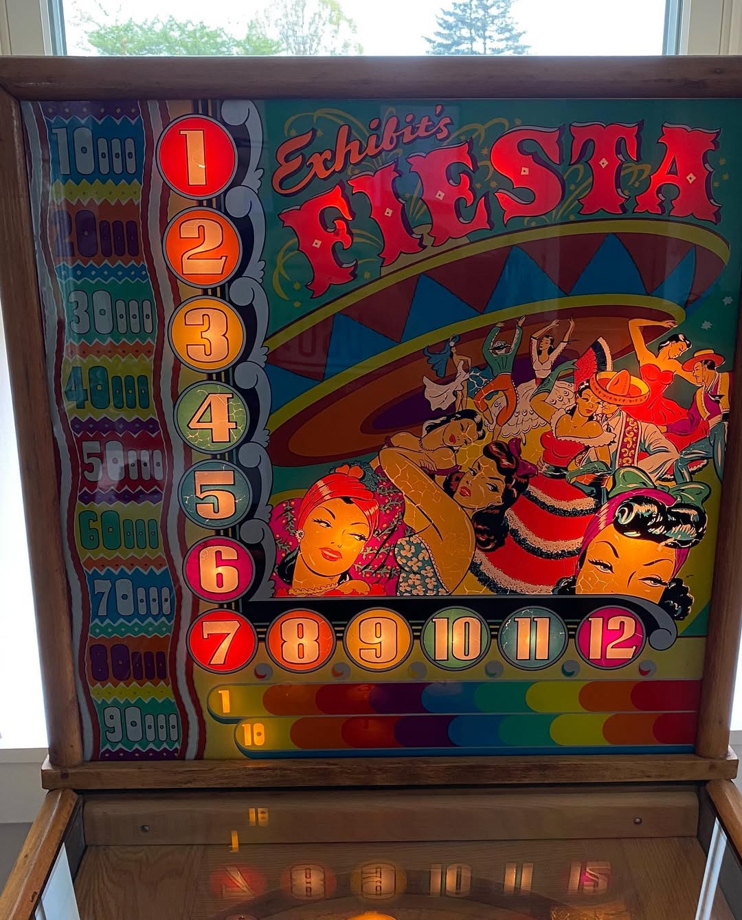 The Exhibit Fiesta is a stunning example of vintage craftsmanship, featuring hand-painted artwork, mechanical scoring, and classic bumpers and targets. Built in 1946, it represents one of the most collectible eras in pinball history — combining simple, skill-based play with beautiful, mid-century design.