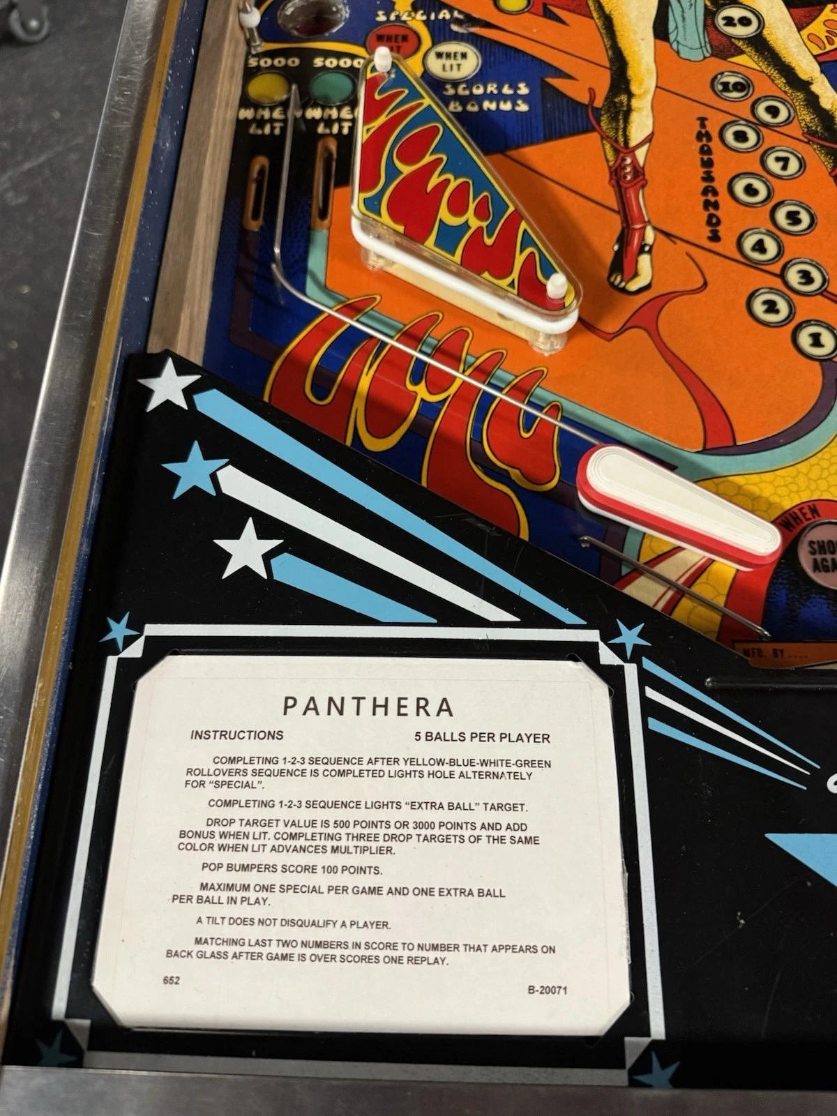 Panthera pinball machine 1980, Gottlieb Panthera pinball, classic 1980 pinball machine, fully serviced vintage pinball, collectible Panthera pinball, jungle-themed pinball, retro arcade game, 1980 Gottlieb arcade machine, Panthera collector pinball, smooth gameplay pinball machine.