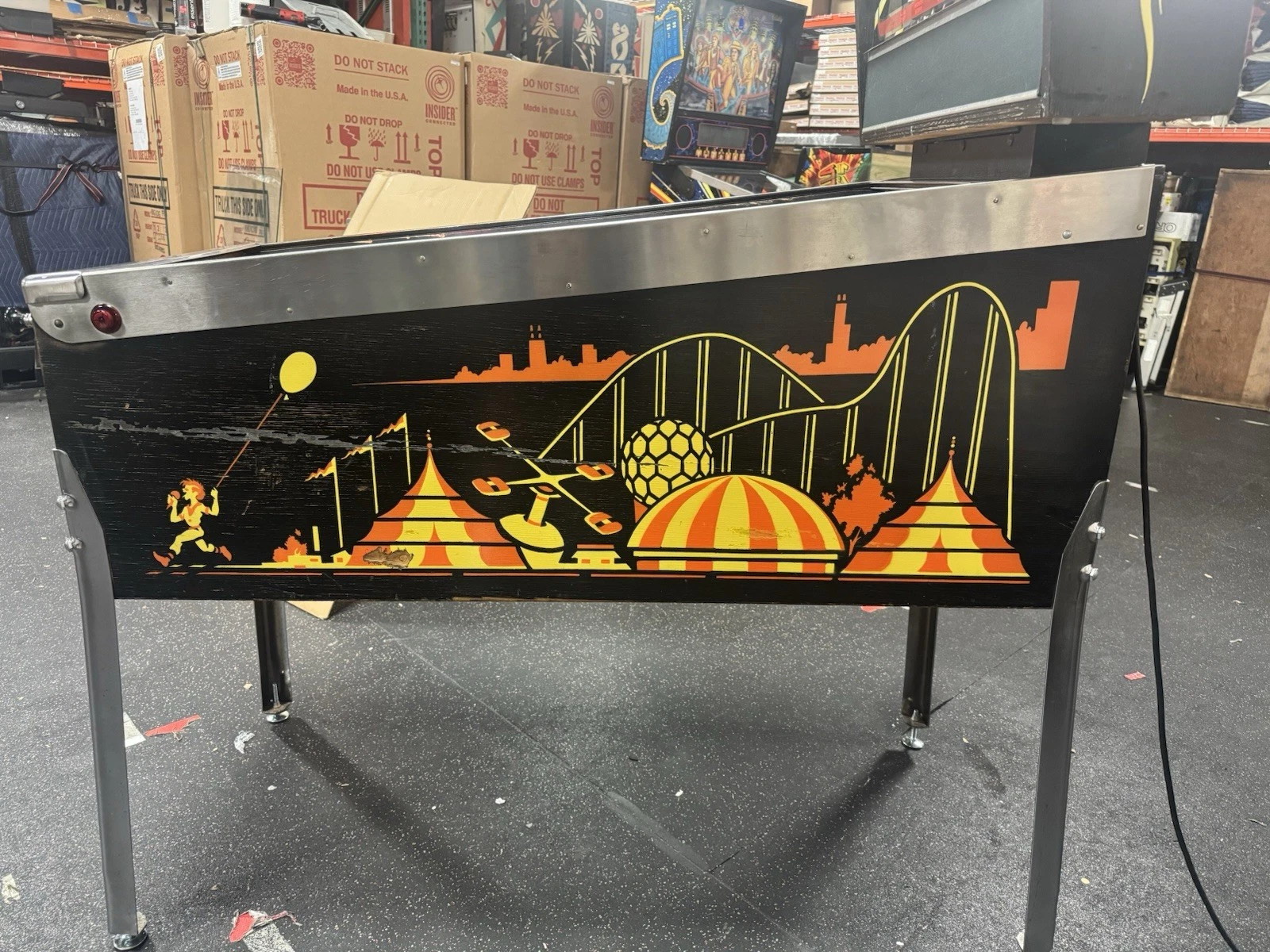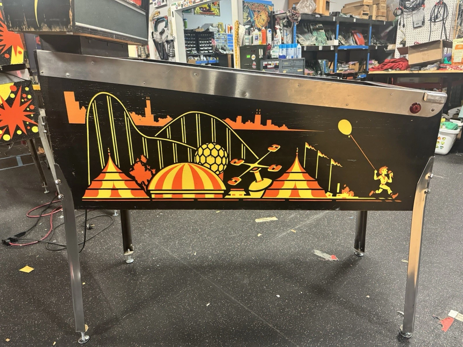 The Comet Pinball Machine stands out for its vibrant and nostalgic amusement park-themed artwork: