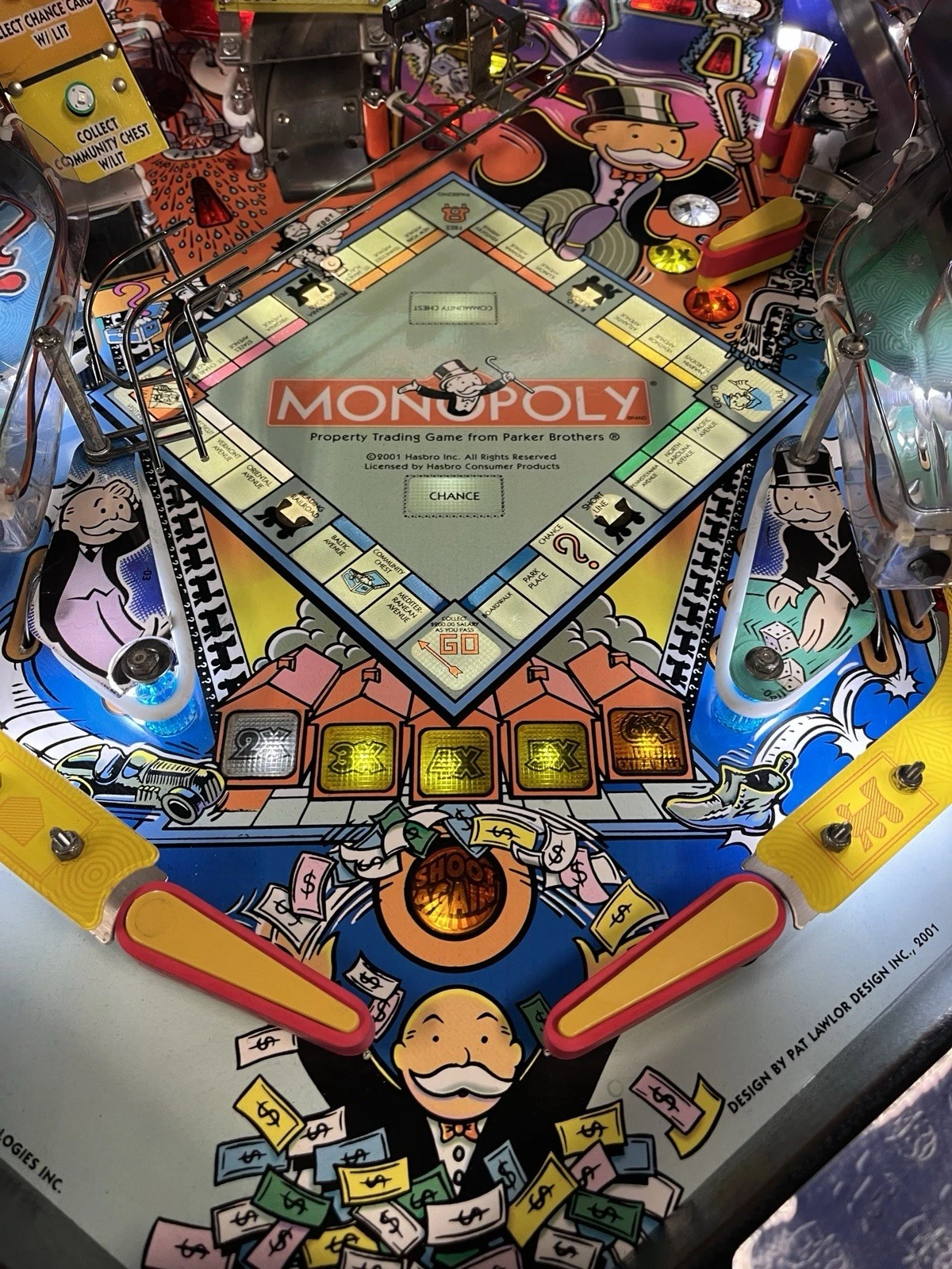 Playfield Artwork – Full-color graphics depict Monopoly streets, tokens, and chance/community chest features.