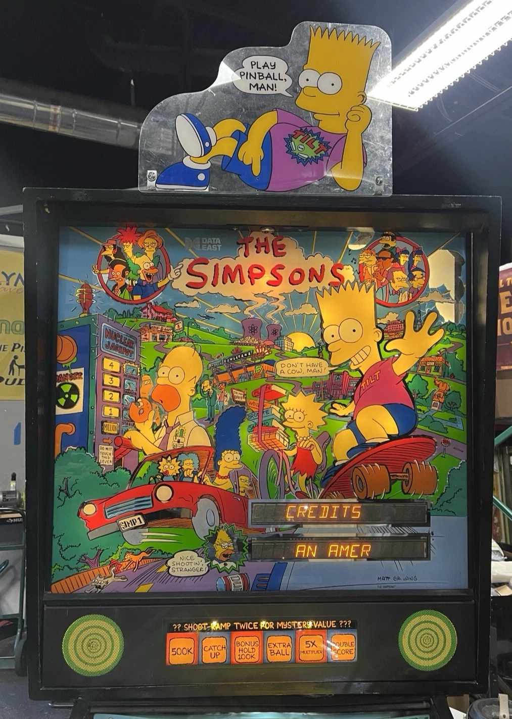 Simpsons pinball machine, Data East Simpsons pinball, fully serviced Simpsons pinball, licensed TV show pinball, collectible Simpsons arcade game, retro arcade pinball, home arcade Simpsons, multi-ball Simpsons pinball, 1990 pinball machine, vintage TV-themed pinball.