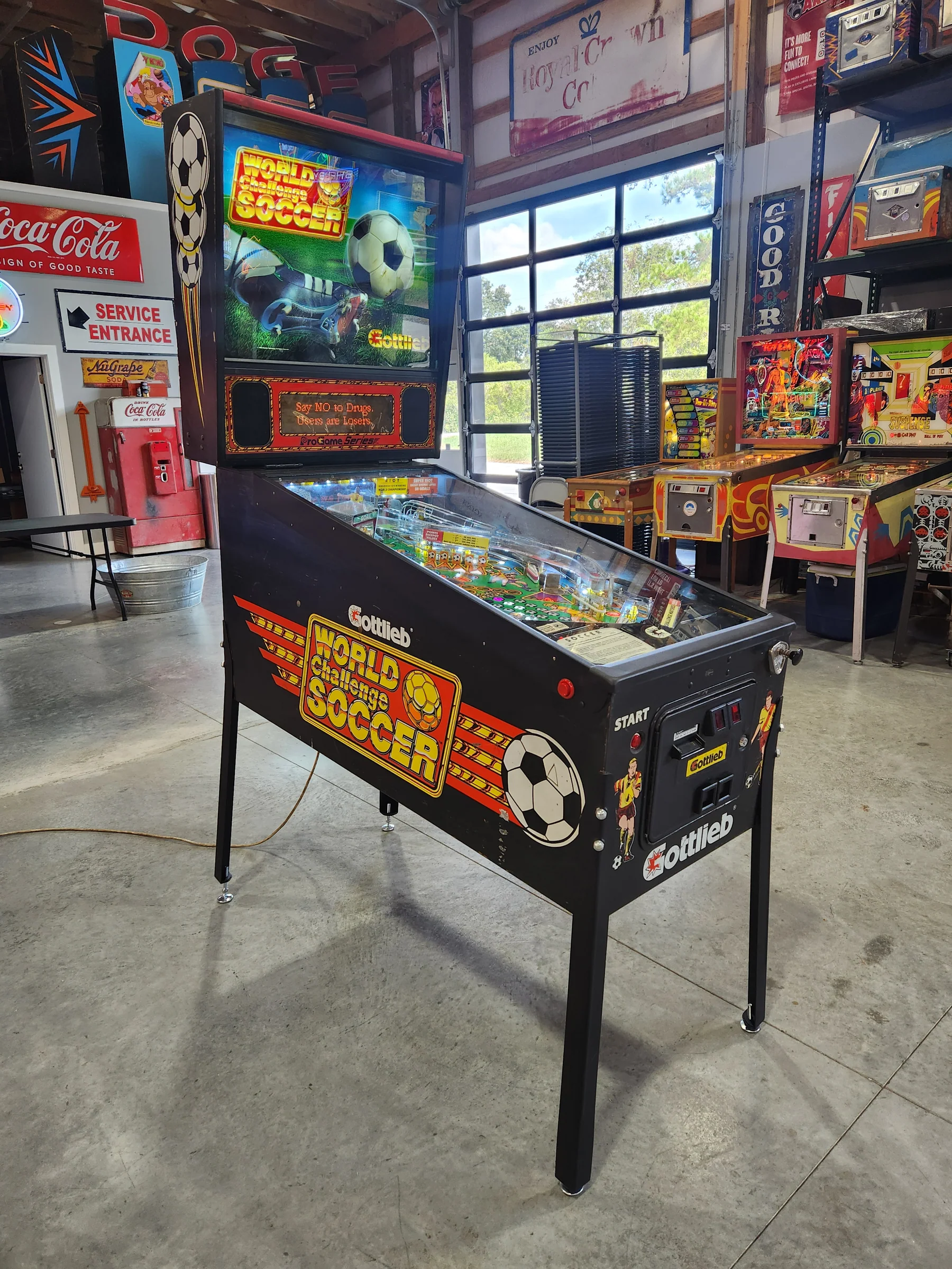 Score big with this rare and beautifully restored 1994 Gottlieb World Challenge Soccer Pinball Machine—a must-have for any pinball collector or soccer enthusiast. This international-themed pinball machine is especially rare in the United States, as most units were originally shipped overseas. We believe this particular machine made a round trip to Brazil and back, adding to its global history and collectibility.